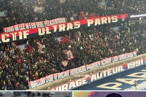 巴黎球迷此役拉出橫幅,祝賀李剛?cè)剩▉喿懵?lián)最佳國際球員)和阿什拉夫(非洲足球先生)獲獎。