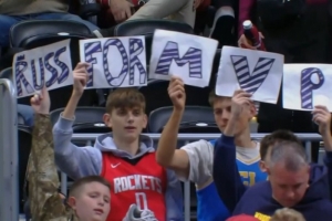 在本場比賽中,有一位身穿火箭0號的球迷舉著威少M(fèi)VP的牌子。
