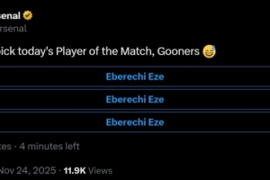 賽后阿森納官方在社媒發(fā)布投票,評(píng)選本場(chǎng)最佳球員,三個(gè)選項(xiàng)均為上演帽子戲法的埃澤。