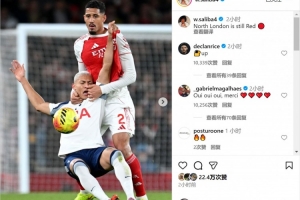 薩利巴社媒曬出防守里沙利松的照片,慶祝球隊(duì)取勝,配文:“北倫敦依然是紅色的?!?/p>