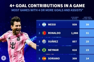 體育資訊11月24日訊 邁阿密國際在今日季后賽4-0完勝辛辛那提FC,梅西1射3傳獨(dú)造4球?!掇D(zhuǎn)會(huì)市場》數(shù)據(jù)統(tǒng)計(jì)顯示,梅西也是俱樂部層面單場參與進(jìn)球4+次數(shù)最多的球員。