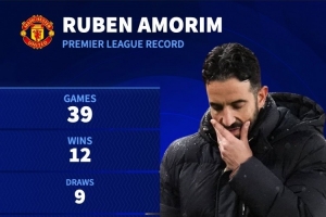 德國(guó)轉(zhuǎn)會(huì)市場(chǎng)統(tǒng)計(jì)了阿莫林執(zhí)教曼聯(lián)的英超數(shù)據(jù),他帶領(lǐng)曼聯(lián)參加39場(chǎng)英超比賽,戰(zhàn)績(jī)12勝9平18負(fù),凈勝球-10,場(chǎng)均拿到1.15分。