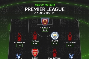 體育資訊11月25日訊 WhoScored根據(jù)球員的評(píng)分排出了英超第12輪最佳陣容,埃澤、魯本·迪亞斯、羅杰斯在列,諾丁漢森林4名球員入選。