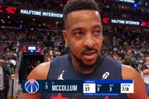 上半場,奇才后衛(wèi)麥科勒姆手感滾燙,打了18分鐘13投10中,三分8中7狂砍27分2籃板2助攻1搶斷,正負(fù)值+22。