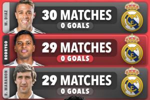 體育資訊11月26日訊 皇馬前鋒羅德里戈本賽季狀態(tài)低迷,出戰(zhàn)14場比賽1球未進。目前羅德里戈俱樂部連續(xù)進球荒已經長達29場,排名皇馬隊史第2,僅次于30場球荒的馬里亞諾。羅德里戈上次代表皇馬取得進球,還是今年3月對陣馬競的比賽。