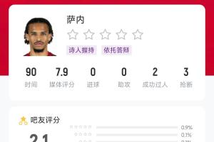 但是薩內(nèi)的表現(xiàn)極差,賽后數(shù)據(jù)顯示他有2次錯失進球機會,多達98%的吧友只給他打1星,并表達了對他的不滿: