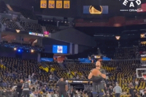 賽前熱身環(huán)節(jié),庫(kù)里秀了一把空接背扣,落地后還原地轉(zhuǎn)身耍帥,心情不錯(cuò)。