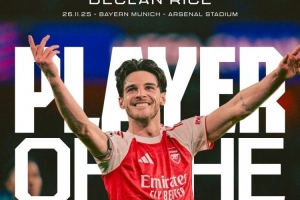 體育資訊11月27日訊 歐冠聯(lián)賽階段第5輪比賽,賴斯踢滿全場(chǎng),幫助阿森納主場(chǎng)3-1擊敗拜仁。