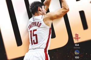 體育資訊11月27日訊 當(dāng)?shù)貢r間感恩節(jié),火箭官方曬出了戰(zhàn)勝勇士的贏球海報,封面人物是謝潑德,背景字樣是“勝利(dub)”。