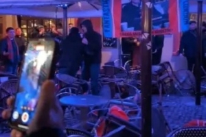現(xiàn)場畫面顯示,這些球迷在加約集市廣場投擲咖啡館座椅、互相斗毆,導致周邊商鋪窗戶被砸碎,玻璃遍地,附近酒吧被迫緊急停業(yè)。
