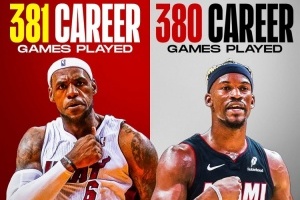 巴特勒在熱火5.5賽季(本賽季算在內(nèi))合計(jì)出戰(zhàn)380場比賽(316場常規(guī)賽+64場季后賽)