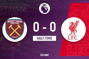 上半場補(bǔ)時(shí)1分鐘,西漢姆聯(lián)0-0利物浦。