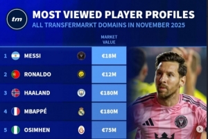 體育資訊12月3日訊 德轉(zhuǎn)列出了11月份球員頁面瀏覽量排名,前三依次為梅西、C羅、哈蘭德。