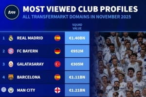 體育資訊12月3日訊 德轉(zhuǎn)列出了11月份俱樂部頁面瀏覽量排名,皇馬、拜仁、加拉塔薩雷前三。