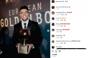 體育資訊12月3日訊 在《都靈體育報(bào)》主辦的歐洲金童獎(jiǎng)?lì)C獎(jiǎng)典禮上,杜埃領(lǐng)取了2025年金童獎(jiǎng)杯。