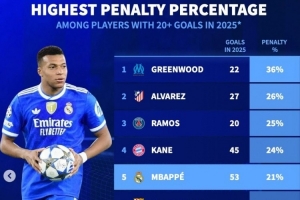 2025進(jìn)球20+球員點(diǎn)球占比榜:青木居首 凱恩、姆巴佩、哈蘭德在列