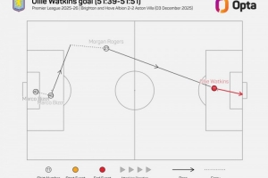 體育資訊12月4日訊 維拉在本輪英超對(duì)陣布萊頓,羅杰斯助攻沃特金斯破門。