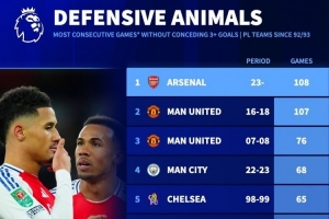 92-93賽季以來英超球隊(duì)連續(xù)失球少于3粒比賽場次紀(jì)錄: