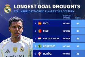 體育資訊12月04日訊 西甲第19輪,皇馬客場(chǎng)3-0戰(zhàn)勝畢爾巴鄂競(jìng)技。羅德里戈在第78分鐘替補(bǔ)登場(chǎng),未能取得進(jìn)球,這是他連續(xù)31場(chǎng)比賽未能取得進(jìn)球。
