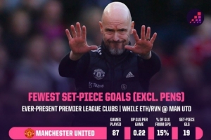 滕哈赫共率曼聯(lián)踢了87場英超比賽,通過定位球打進(jìn)19球,平均每場0.22球,定位球進(jìn)球占球隊總進(jìn)球數(shù)僅為15%。本賽季,曼聯(lián)13輪英超比賽已經(jīng)通過定位球打進(jìn)10球,和踢了14輪的阿森納持平。曼聯(lián)本賽季場均可通過定位球打進(jìn)0.77球,定位球進(jìn)球數(shù)占球隊總進(jìn)球數(shù)的47.6%。