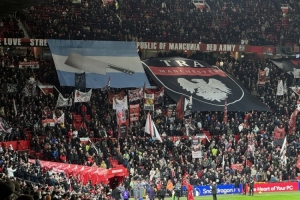 在死忠看臺,一眾曼聯(lián)球迷打出大幅tifo表達(dá)對利馬的支持,將阿根廷國旗里的太陽替換為了菜刀…