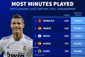 體育資訊12月5日訊 德國轉(zhuǎn)會市場統(tǒng)計了21世紀(jì)五大聯(lián)賽非門將球員的出場時間,并列出榜單,C羅居首,拉莫斯、梅西二三位。