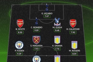 后衛(wèi): 本·懷特(8.50分,阿森納)、羅梅羅(9.09分,熱刺)、格伊(8.68分,水晶宮)、卡拉菲奧里(7.90分,阿森納)