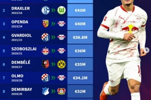 體育資訊1月31日訊 哈維-西蒙斯正式由巴黎加盟萊比錫,固定轉(zhuǎn)會(huì)費(fèi)5000萬歐,另外還有價(jià)格不菲的浮動(dòng)獎(jiǎng)金。德轉(zhuǎn)盤點(diǎn)了德甲球隊(duì)除拜仁外引援轉(zhuǎn)會(huì)費(fèi)紀(jì)錄,其中西蒙斯居首,具體如下: