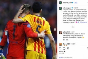 特爾施特根寫道:布斯克茨,祝賀你擁有世界級的職業(yè)生涯??吹侥阋杂忠蛔劚Y束職業(yè)生涯,真是令人驚嘆!你是巴薩和足壇傳奇,也是有史以來最出色的中場之一。與你多次并肩作戰(zhàn)是我的榮幸,祝你在人生的下一個篇章中一切順利!