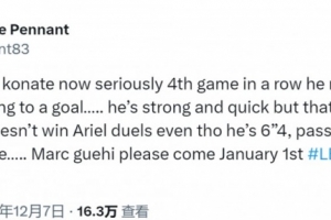 彭南特寫道:“我真是受夠科納特了,這已經是他連續(xù)第四場比賽犯錯導致失球了……他雖然身體強壯速度快,但僅此而已,技術簡直糟糕透頂,明明身高1米93卻連空中對抗都贏不了,傳球水平跟業(yè)余聯賽球員沒兩樣,格伊請務必在1月1日加盟利物浦。”