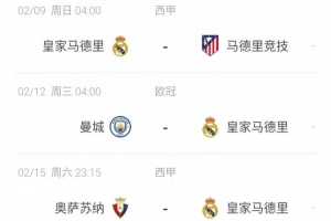 其中,皇馬將在北京時間2月9日4:00主場迎戰(zhàn)馬競,3天后的2月12日4:00就將客戰(zhàn)曼城,第二回合在2月19日4:00。