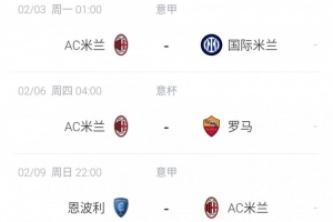 其中,北京時間2月3日將迎來本賽季意甲第二次米蘭德比,3天后的2月6日在意大利杯迎戰(zhàn)羅馬;12日和19日在歐冠附加賽迎戰(zhàn)費耶諾德,AC米蘭先客后主。
