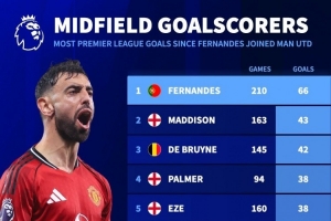 據(jù)德國轉(zhuǎn)會市場統(tǒng)計,B費(fèi)加盟曼聯(lián)以來出戰(zhàn)210場英超比賽,打進(jìn)66球,同期英超進(jìn)球數(shù)量中場球員之中最多。