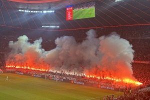 體育資訊12月10日訊 拜仁在本輪歐冠對陣葡體,南看臺死忠在比賽中燃放焰火。