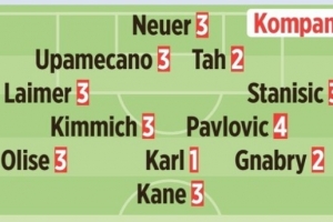 首發(fā):諾伊爾3分、萊默爾3分、于帕梅卡諾3分、若納坦·塔2分、斯坦尼西奇3分、基米希3分、帕夫洛維奇4分、奧利塞3分、卡爾1分、格納布里2分、凱恩3分