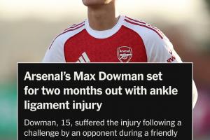 體育資訊12月10日訊 據(jù)TA記者奧恩斯坦消息,15歲阿森納小將道曼腳踝韌帶受傷,將傷缺2個(gè)月。