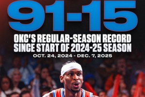 上賽季常規(guī)賽雷霆68勝14負(fù);本賽季至今他們23勝1負(fù)。