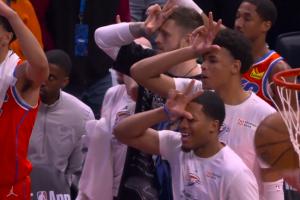 替補席全員必出杰倫威慶祝動作,半場雷霆三分19中13!