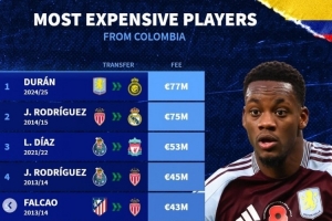 體育資訊2月1日訊 利雅得勝利已經(jīng)官宣7700萬歐基礎(chǔ)轉(zhuǎn)會費(fèi)簽下維拉前鋒杜蘭,數(shù)據(jù)統(tǒng)計顯示這也打破了哥倫比亞籍球員的歷史轉(zhuǎn)會費(fèi)紀(jì)錄。
