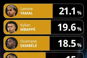 體育資訊12月12日訊 環(huán)球足球獎公布了年度最佳前鋒的投票情況,亞馬爾21.1%領跑。