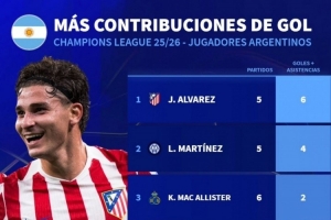 體育資訊12月12日訊 德國(guó)轉(zhuǎn)會(huì)市場(chǎng)統(tǒng)計(jì)了本賽季阿根廷球員在歐冠的參與進(jìn)球數(shù)量,并列出榜單。