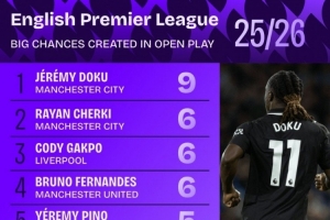 本賽季英超運動戰(zhàn)創(chuàng)造重大機會排名: