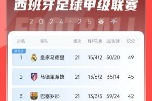 目前的西甲積分榜,皇馬49分居首,馬競(jìng)45分第二,巴薩42分第三。
