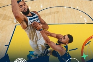 賽后森林狼發(fā)布贏球海報(bào),封面人物為戈貝爾,背景則是在內(nèi)線防守他的庫里。