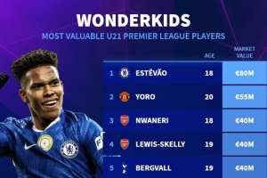 體育資訊12月13日訊 德國(guó)轉(zhuǎn)會(huì)市場(chǎng)列出了英超U21球員身價(jià)排名,埃斯特旺8000萬(wàn)歐居首,約羅5500萬(wàn)歐次席。