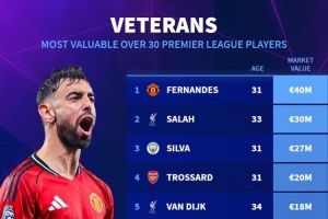 體育資訊12月13日訊 德國(guó)轉(zhuǎn)會(huì)市場(chǎng)列出了英超年齡30+球員身價(jià)排名,B費(fèi)居首,薩拉赫次席。