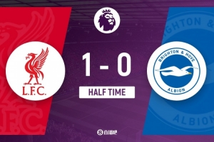 傷停補(bǔ)時3分鐘。上半場比賽結(jié)束,利物浦1-0布萊頓。