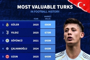 土耳其球員歷史身價榜:居萊爾9000萬歐居首,伊爾迪茲次席