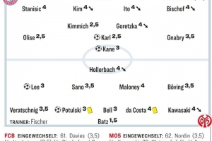 體育資訊12月15日訊 德甲第14輪比賽,拜仁主場2-2戰(zhàn)平美因茨,德國媒體《踢球者》對兩隊球員進行了評分,奧利塞、基米希、卡爾2.5分拜仁隊內(nèi)最高。