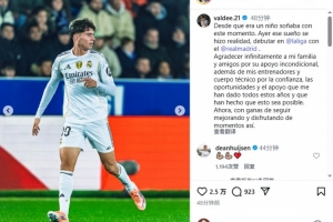 巴爾德佩尼亞寫道:“自童年起我就夢(mèng)想著這一刻,昨日這個(gè)夢(mèng)想成真了,在皇家馬德里完成西甲聯(lián)賽首秀?!?/p>